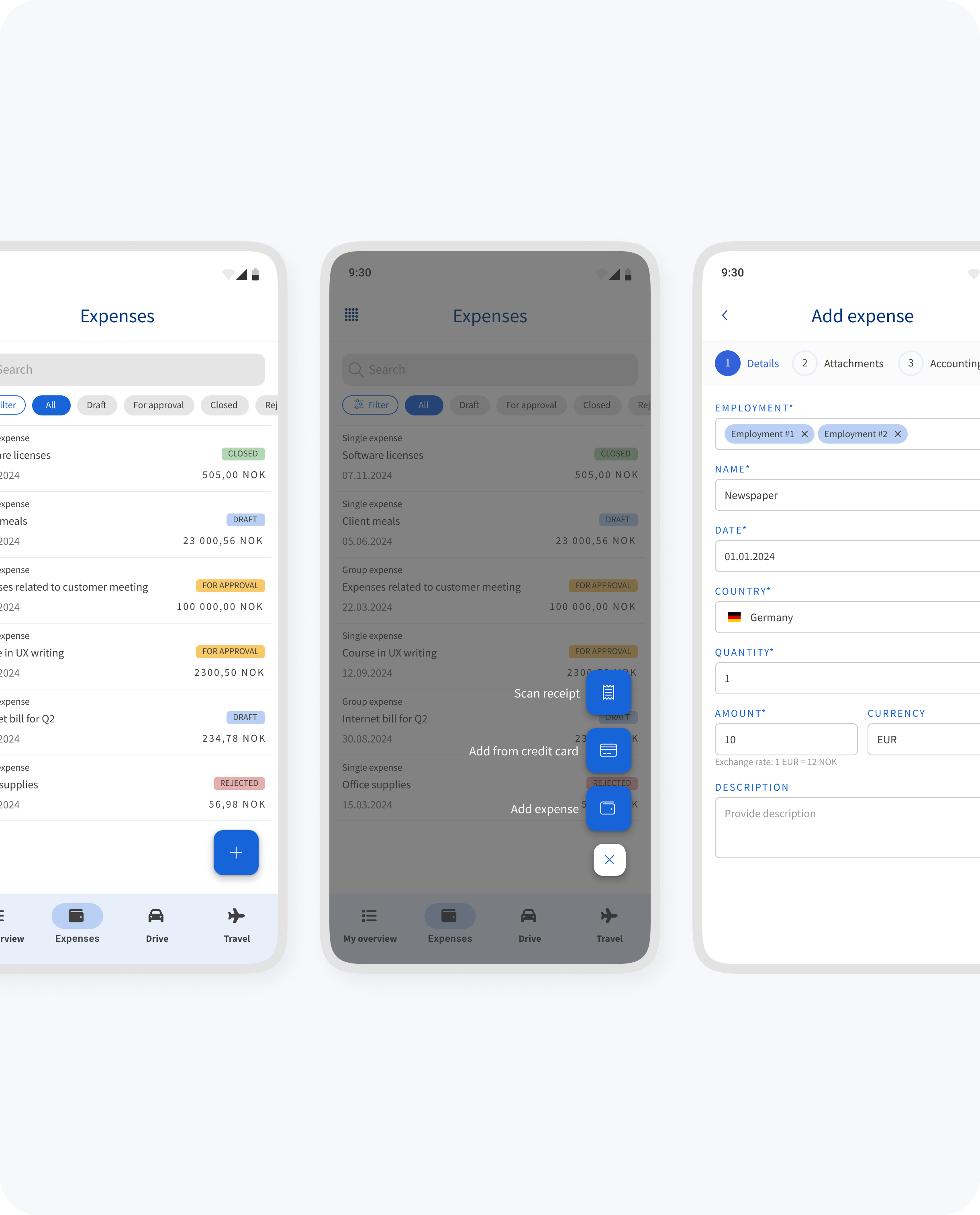 My focus was creating a simple, intuitive experience that communicates with the existing web application. The mobile experience reflects the web version but with a clear, step-by-step path for registering expenses and business trips. This means employees will be able to log expenses faster and easier while traveling and eliminate the hassle of keeping physical receipts.